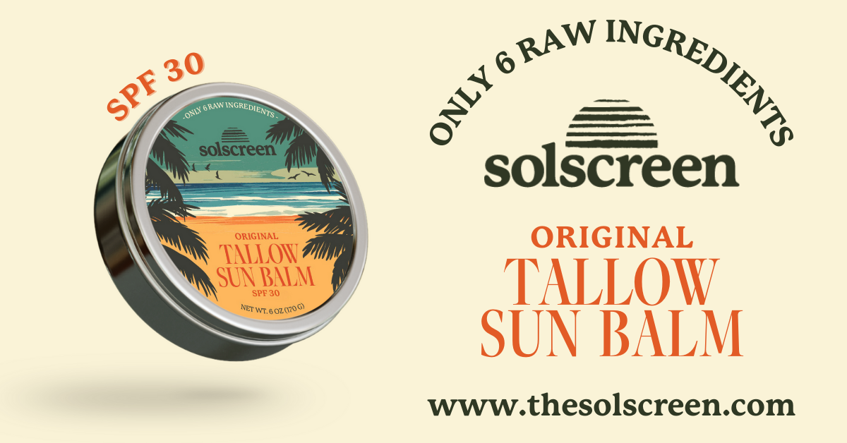 At Solscreen, we trust our history, our ancestors and our instincts. By finding inspiration in our past, we craft tallow-based products that are aligned with nature, 100% edible, natural, reef-friendly, paleo-friendly, and effective products made with real ingredients you can pronounce. Our Ancestral Skin Protection ensures that your skin is nourished and protected, allowing you to embrace the sun without the harsh chemicals. Bye Bye, Big Sunscreen.